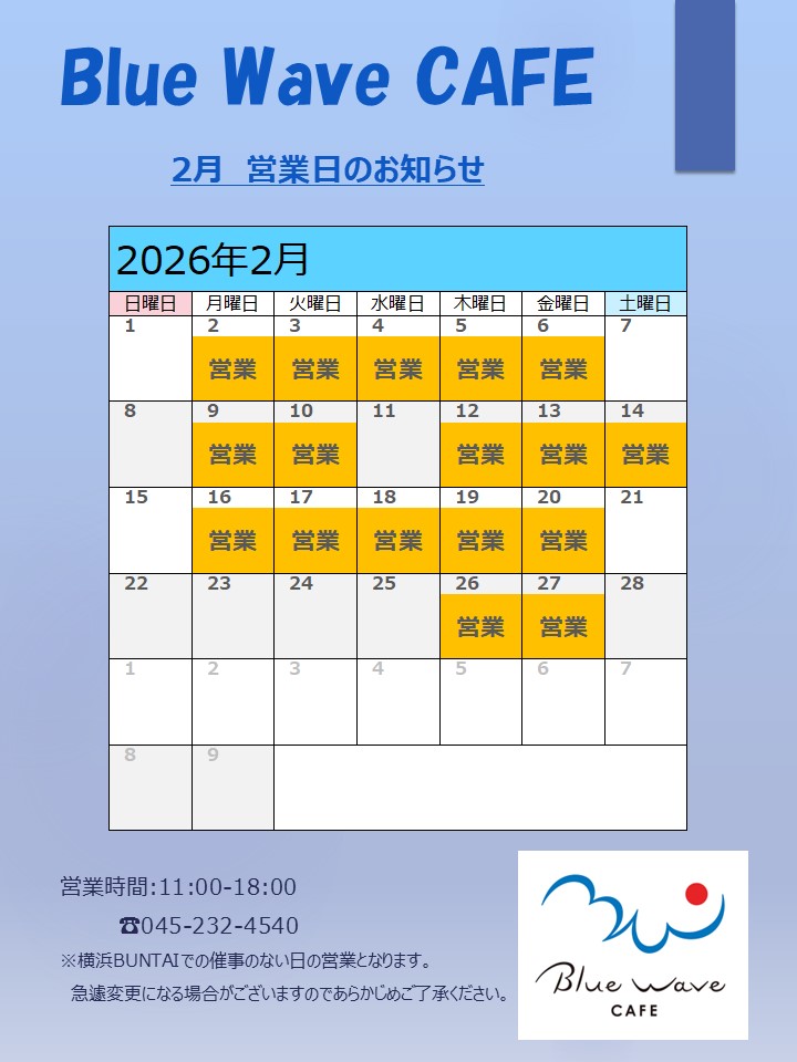 "BLUE WAVE CAFE" 2月営業日のお知らせ